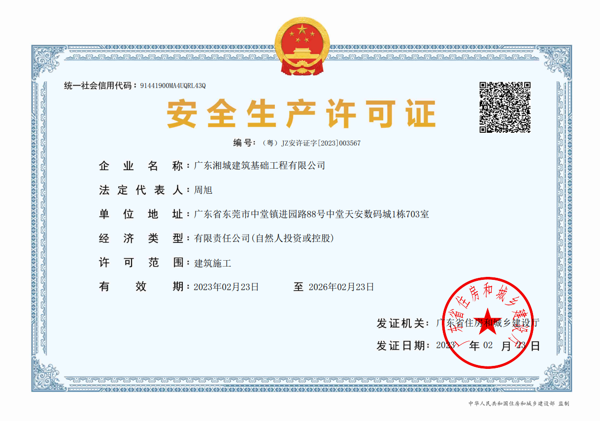 廣東湘城建筑基礎(chǔ)工程有限公司,成立于2016年,注冊(cè)資金4888萬(wàn)元,持有地基基礎(chǔ)工程專(zhuān)業(yè)承包壹級(jí)資質(zhì),具有安全生產(chǎn)許可證。可承接各種基礎(chǔ)類(lèi)施工,包括各類(lèi)樁基礎(chǔ)、基坑支護(hù)、邊坡支護(hù)、地基強(qiáng)夯處理等施工業(yè)務(wù)。公司為地基與基礎(chǔ)工程專(zhuān)業(yè)承包、工程施工、技術(shù)咨詢、技術(shù)開(kāi)發(fā)、技術(shù)服務(wù)、信息咨詢實(shí)體型企業(yè)。